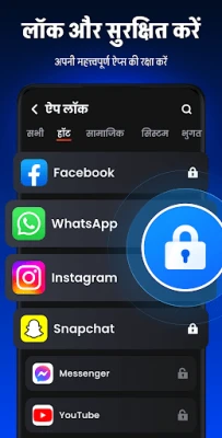 ऐपलॉक आपके ऐप्स और निजी डेटा की पूर्ण सुरक्षा सुनिश्चित करता है। अपनी महत्वपूर्ण जानकारी को पिन, पैटर्न या फिंगरप्रिंट से सुरक्षित करें। अनधिकृत पहुंच को तुरंत रोकें और अपनी गोपनीयता को एक क्लिक पर सुरक्षित रखें।