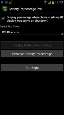बैटरी का प्रतिशत आपको केवल एक संख्या से ज़्यादा देता है। इसे अपने अंदाज़ में ढालने के लिए कई रंग विकल्पों में से चुनें, ताकि यह आपके स्टेटस बार के रंग के साथ सटीक रूप से घुल-मिल जाए – चाहे आप Android 4.x के लिए ICS ब्लू चाहते हों, या 2.3.x के लिए सफ़ेद/ग्रे। यहां तक कि एक गतिशील रंग विकल्प भी है जो बैटरी स्तर के आधार पर हरा, पीला या लाल दिखाता है। इसके साथ ही, ऐप अधिसूचना ड्रॉपडाउन में बैटरी की सेहत, तापमान और वोल्टेज जैसी महत्वपूर्ण जानकारी भी प्रदर्शित करता है। यह सब एक अत्यंत हल्के डिज़ाइन में, जो पृष्ठभूमि में निष्क्रिय रहने पर न्यूनतम बैटरी का उपयोग करता है।