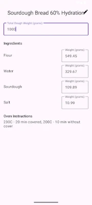 यह समय बचाने वाली सुविधा आपकी बेकिंग प्रक्रिया को सरल बनाती है। "बेकर प्रतिशत कैलकुलेटर" के साथ, आप अपनी इच्छित कुल आटे का वजन दर्ज करके किसी भी रेसिपी को तुरंत बढ़ा या घटा सकते हैं, और यह स्वचालित रूप से प्रत्येक सामग्री का सटीक वजन प्रदान करेगा। चाहे आपको एक रोटी बनानी हो या दर्जनों, यह सुनिश्चित करता है कि आपकी हर तैयारी में माप बिल्कुल सही हो। अपनी पाक कला की कृतियों को साथी बेकर्स के साथ साझा करना भी बेहद आसान है – बस एक सरल टेक्स्ट संदेश या एक सुविधाजनक क्यूआर कोड के माध्यम से अपनी बेहतरीन रेसिपी साझा करें।