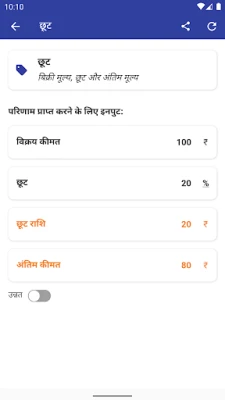 "प्रतिशत कैलकुलेटर" की कार्यक्षमता एक अंतर्निहित पूर्ण-सुविधा वाले कैलकुलेटर के साथ और भी बेहतर हो जाती है। इसकी बुद्धिमान प्रणाली आपको केवल ज्ञात मान दर्ज करने की अनुमति देती है, और यह स्वचालित रूप से शेष अज्ञात मानों की गणना कर देता है, जिससे समय और प्रयास दोनों की बचत होती है। आप टाइप करते ही तत्काल परिणाम प्राप्त करेंगे, जिससे गणना प्रक्रिया बेहद कुशल बन जाती है। उपयोगकर्ता अनुभव को बढ़ाते हुए, यह ऐप स्वचालित डार्क या लाइट मोड का समर्थन करता है और लैंडस्केप और पोर्ट्रेट दोनों ओरिएंटेशन में सहज रूप से काम करता है।