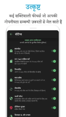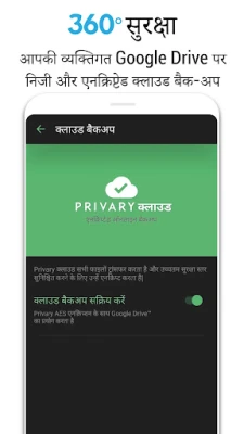 यह शक्तिशाली वॉल्ट SD-कार्ड के लिए पूर्ण समर्थन प्रदान करता है और आपके डेटा को अपनी डिवाइस पर ही सुरक्षित रखता है – सर्वर पर भेजने का कोई जोखिम नहीं। अतिरिक्त मानसिक शांति के लिए, आप अपनी एन्क्रिप्टेड फ़ाइलों का सुरक्षित क्लाउड बैकअप सीधे अपने निजी Google Drive™ पर बना सकते हैं। चाहे वह कोई भी फ़ाइल प्रकार हो – mp4, wmv, mkv या कोई अन्य दस्तावेज़ – Privary उन सभी को सहजता से संभालता है। जब चाहें, अपनी फ़ाइलों, फ़ोटो या वीडियो को वापस अपनी सामान्य गैलरी में लाने की सुविधा भी उपलब्ध है, जिससे आप पूर्ण लचीलेपन का आनंद ले सकें। Privary वास्तव में एक निजी फ़ाइल प्रबंधक है जो आपकी डिजिटल संपत्ति को सुरक्षित और गोपनीय रखता है।
